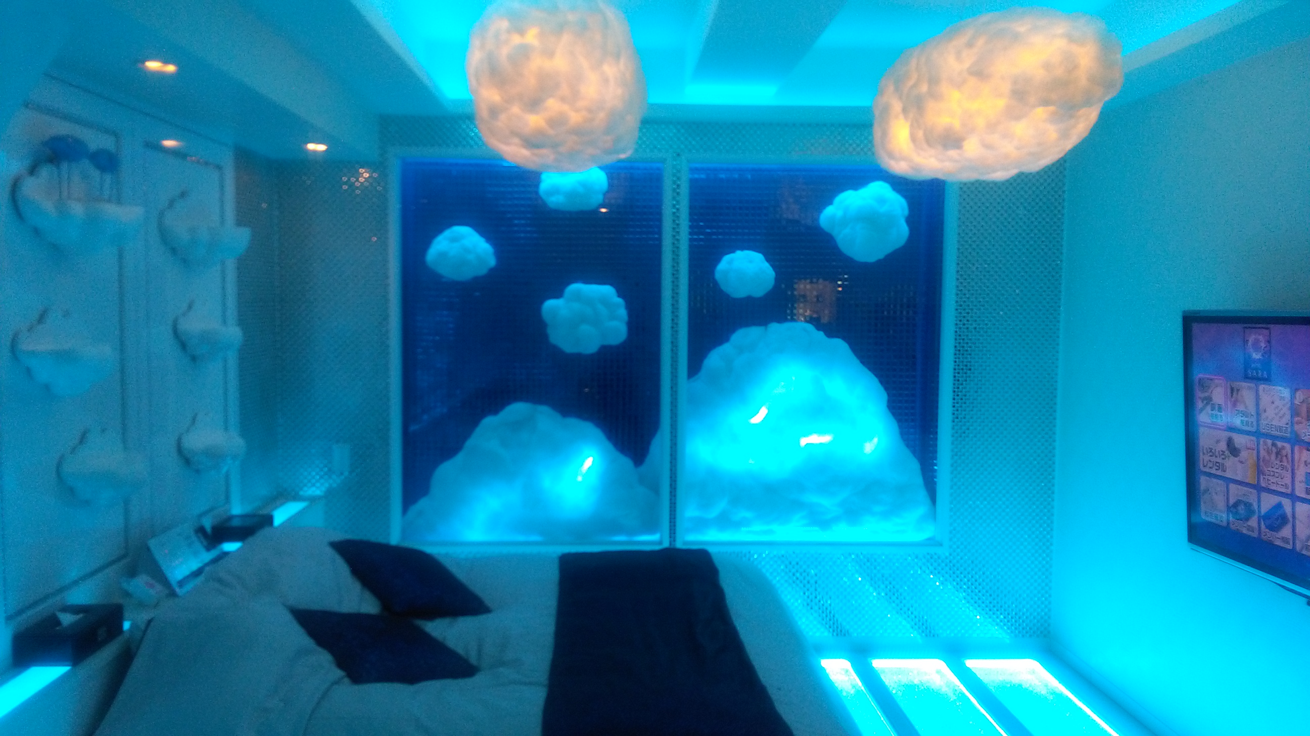 シーリングライトとしてのモコモコの雲や、ベッド周りのフロア一面やキャビネット周りに、ガラス張りで仕込んであるスカイブルーのライティング、、壁はツルツル&真っ白で、いたる所にキラキラのラインストーンのような飾り、、